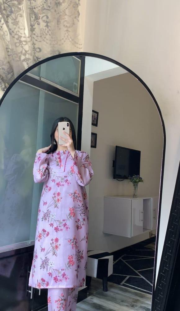 Bring effortless charm to your wardrobe with this stitched 2‑piece outfit crafted from breathable Swiss lawn fabric. With its soft pink tone and all‑over printed design, this set offers a blend of casual comfort and stylish flair. The round‑neck shirt pairs perfectly with the matching trousers, making it an ideal choice for work, casual gatherings, or day‑to‑day elegance.