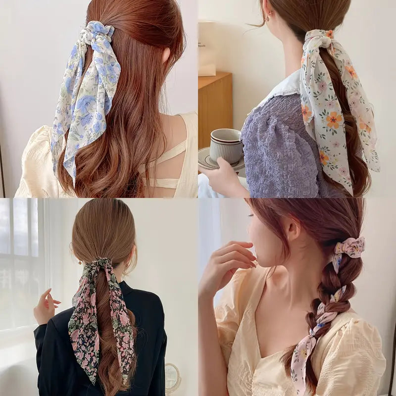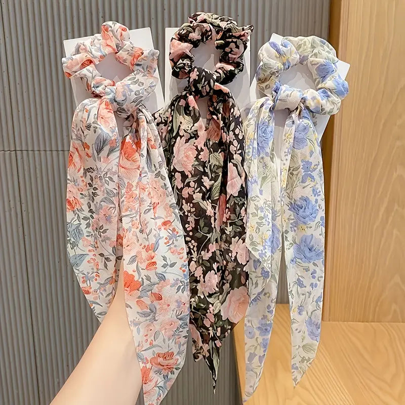 floral hair scrunchies, bow tassel scrunchies, soft fabric hair ties, cute hair accessories, decorative hair ties, occasion hair ties, durable hair ties, women’s hair scrunchies set, floral bow hair ties, stylish hair accessories for women