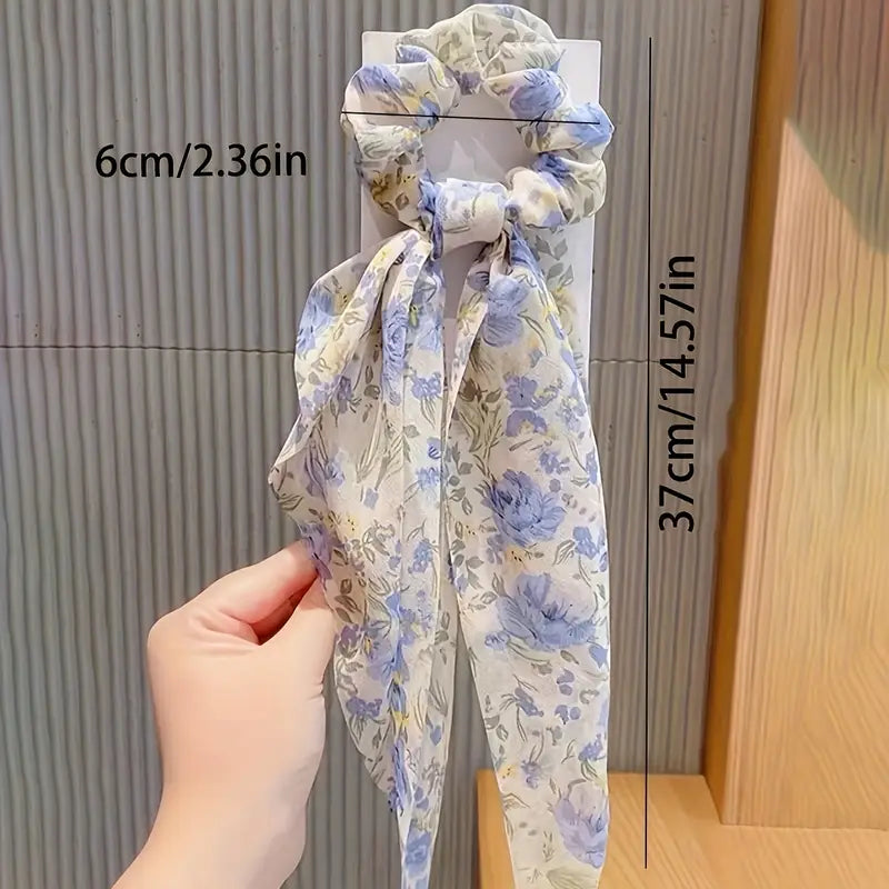 • Style: floral scrunchies with bow and tassel accents