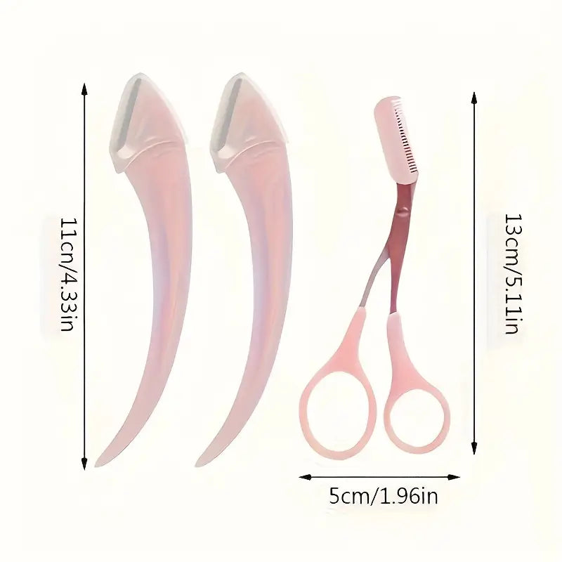 Short DescriptionTidy and shape brows with control. This 2-piece pink set pairs curved stainless steel scissors with a comb guide for even trimming, plus non‑slip finger grips for...
