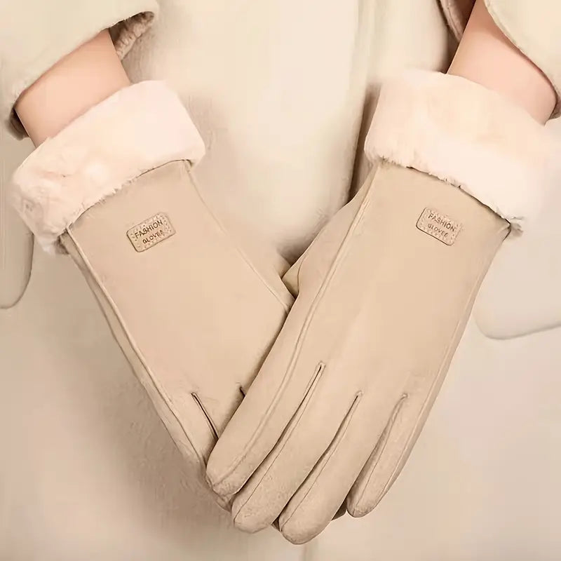 Fleece-Lined • Thick Beige with Fur Cuff • Non-Elastic • Touchscreen-Friendly